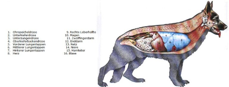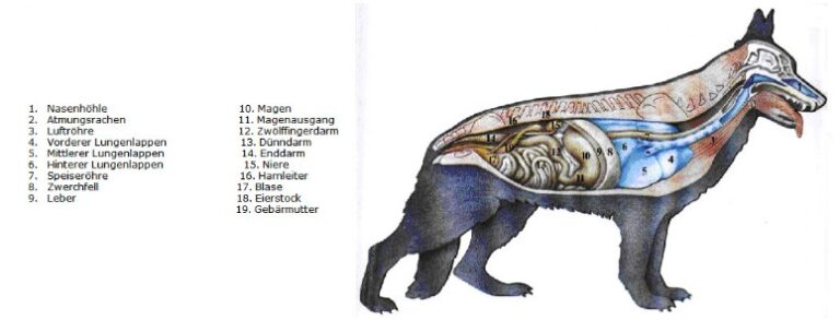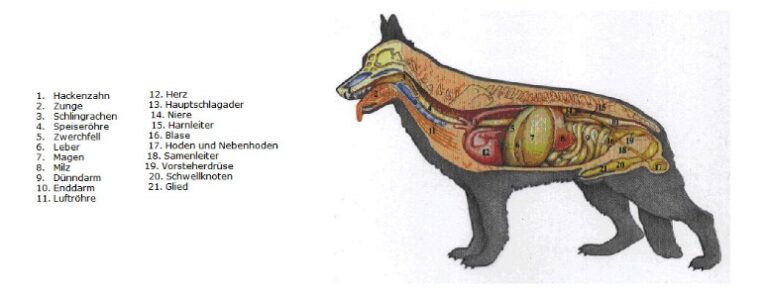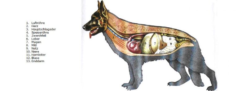 Im Bereich der Maulhöhle befinden sich die kräftig ausgebildeten Zähne, von denen die Hakenzähne oder Fangzähne auffallen. Besondere Bedeutung für die Nahrungsaufnahme haben im Oberkiefer und Unterkiefer die Reißzähne, mit denen die Hunde die Nahrung abreißen. Diese Nahrung wird in der Maulhöhle eingespeichelt (Speicheldrüsen) und dann durch die Speiseröhre in den Magen transportiert, wo die Verdauung eingeleitet wird. Die Nahrung wird im Dünndarm mit den Abschnitten Zwölffingerdarm (11), Leerdarm und Hüftdarm weiter aufgespalten, wobei Verdauungssäfte aus der Leber (9) und der Bauchspeicheldrüse helfen. Im Dickdarm mit den Abschnitten Blinddarm, Grimmdarm und Enddarm (12) wird die Verdauung beendet und die nicht verdauten Reste werden zum Kot eingedickt. Leber (9) und Bauchspeicheldrüse unterstützen durch Abgabe bestimmter Säfte die Verdauungstätigkeit.