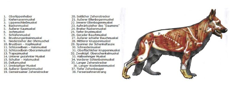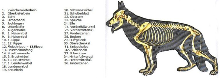 Das tragfähige Skelettsystem gibt dem Hundekörper seine Stabilität und  schützt gleichzeitig empfindliche Organe wie Herz und Lunge und das  Gehirn im Kopf. Durch gelenkige Verbindungen der einzelne Knochen untereinander ist überhaupt eine Fortbewegung möglich. Bei den Gelenken kann man einen Beugewinkel und einen Streckwinkel unterscheiden. Wird  das Gelenk gebeugt, so werden die freien Enden der Knochen des Gelenkes  einander genähert, wird es gestreckt, entfernen sich die Knochenenden voneinander. Zur Ausführung der Vielzahl der Bewegungsabläufe sind die  einzelnen Gelenke sehr unterschiedlich gebaut und haben verschiedene Bewegungsradien.