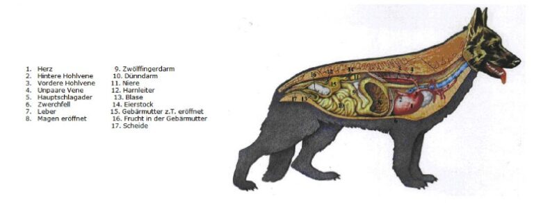 Diese gliedern sich von vorn nach hinten in zwei Eierstöcke (14), zwei  Eileiter, die Gebärmutter (15) mit ihren beiden Hörnern und dem kurzen  Körper, den Gebärmuttermund sowie die Scheide (17) und den  Scheidenvorhof. Beim Deckakt liegt das Glied in der Scheide und der  Samen wird in die Gebärmutter abgegeben. Am Eierstock sind zu dieser  Zeit Eizellen freigeworden, die in den Eileiter fallen. Hier treffen sie  auf die aktiv vorwärts wandernden Samenfäden und es kommt zur  Befruchtung. Die befruchteten Eizellen gelangen in die Gebärmutter, wo  sie sich festsetzen und zu Welpen entwickeln.